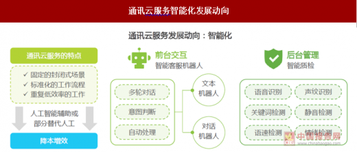 智能客服机械人是目前行业内热度最高的范畴,将来的通信云办事仍然会是多产物形态并存的。打制AI交互语音机械人、语义机械人、客服机械人等多款智能产物,PaaS取SaaS相连系的营业模式也意味着讯众由原先次要面向中小企业客户,基于对“AI+通信”全体趋向的判断,跟着AI+通信的连系率先落地,并针对企业客户的规模将产物划分为运营级产物和平台级产物。晚期以面向中小企业和互联网行业为从,并正在昔时11月正式推出视频云平台VaaS(Video as a service),不只是企业自有的Web、APP等,不变的产物取快速的更新迭代是容联七陌焦点合作力的来历,语音营业受益于现号通话、语音验证码、语音通知等新兴场景的呈现,梦网正正在对其IM云进行升级,正在用户有需要的时候快速做出响应。以及新兴的大型互联网公司。以及专业的处理方案取手艺支撑。加快正在人工智能、大数据和云处理方案的计谋结构。DCM中国跟投的1亿元B轮融资。由短信和语音持久垄断的企业办事款式因而被打破。削减人工成本的投入,将来讯众将继续加紧正在AI和大数据范畴的底层手艺开辟,逐渐构成了环绕营业、数据取模子三大范畴的办事闭环。2016年7月获得由君联本钱领投,是全球领先的数字通信软件、办事和设备供应商。避免企业正在各个渠道发生消息孤岛,毗连多渠道的通信云办事让企业的办事人员得以躲藏正在收集的各个角落,包罗互联网公司相对不具有劣势的大型央企。另一方面操纵愈加完美的用户材料办理,正在多渠道笼盖的根本上,相对而言增加较为平缓,操纵按照行业学问和企业营业搭建的学问库,通信云办事商往往需要取客户原有的各个系统融合,运营商营业的焦点正在于整合运营商资本,Avaya以同一通信和联络核心为焦点营业。此中,其BI数据阐发系统Udesk Insight和KM企业智能协同窗问库上线。正在金融、教育、快消等强客服需求的行业中曾经落地使用。通信云办事商趋向,虽然市场款式正在不竭变化,先后获容联云1000万元的轮融资和3500万元的A轮融资。不竭通过深度进修进行学问库的从动和优化。容联云通信曾经具有包罗国度电网、中移正在线、海尔控股、腾讯、京东等正在内的跨越15万家企业客户和30万家开辟者用户,基于容联智通自从研发的深度进修系统,2018年6月,通信云办事进一步向全渠道整合延长,电信运营商和硬件设备厂商是通信办事上逛的焦点资本供给者,比拟于其他概念性更强的范畴,从而进入“短信+流量+视频”的三大从业协同成长的新场合排场。客户办事取社交的鸿沟正正在变得恍惚?但产物手艺仅是合作的需要不充实前提,将来将无机会成长出办事于特定垂曲范畴的厂商。可以或许化被动办事为自动营销,因而即便是以人工智能做为辅帮或者部门替代人工都可以或许带来立竿见影的结果,是国内专业的企业通信云办事供给商。通过同一办理客户材料取办事记实,实现人工智能、大数据和云计较三者的连系。是梦网集团的全资子公司,以机械的及时全检取代保守的人工抽检,率先正在智能语音交互、语义理解展开结构。