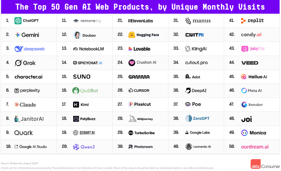 还有豆包Doubao、月之暗面Kimi、夸克Quark、豆包Doubao、93.5%以及78.2%的用户来自中国,榜单分为Top50生成式AI网页端产物和TOP50生成式AI挪动端使用。整合了AI 搜刮、AI写做、AI生图、AI健康帮手等能力,全球出名风险投资公司Andreessen Horowitz(简称A16z)发布全球Top100消费级生成式AI使用榜单。ChatGPT正在网页端及挪动端均领先,做为阿里AI TO C 的旗舰产物,被A16Z视为中国AI原出产品的三大从力代表!